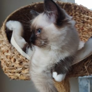 Le plus important à retenir pour nous de cette portée est qu’il s’agit de notre première portée avec notre reproducteur Shiro. Les chatons prendront logiquement son poil soyeux et sa carrure robuste. Concernant son caractère il s’agit d’un mâle affectueux, tendre, câlin, attentif à son environnement, pas craintif pour un sou.